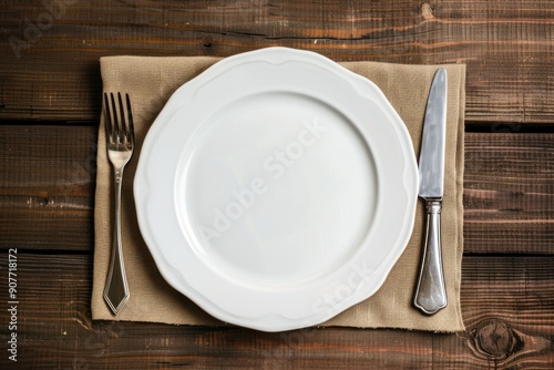 Classic Dinner Plate Setting. Simple and elegant table setting with empty white plate, fork, and knife on a wooden table