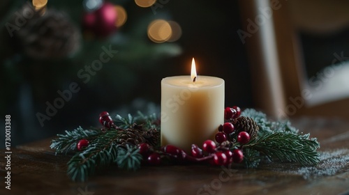 Classic Festive Candle Surrounded by Holiday Decorations in Traditional Christmas Arrangement with Space for Text