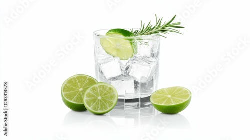 Classic gin and tonic with lime slices and rosemary sprig, on a crisp white background, clean and refreshing