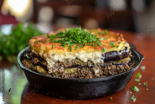 Classic Greek moussaka layers of eggplant ground lamb and bchamel sauce served in a cast iron skillet