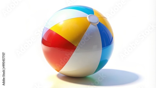 Classic inflatable beach ball with colorful panels is casting a shadow on a white background