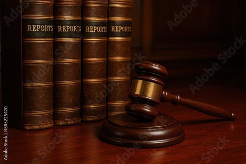 Classic law library scene with leather-bound legal volumes and judicial gavel representing justice system and legal profession