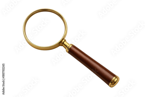 Classic magnifying glass with golden frame and brown leather handle isolated on transparent background