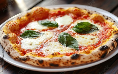 Classic Margherita pizza with melted mozzarella and basil on a white plate