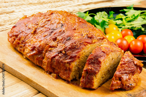 Classic meatloaf on a cutting board on a wooden background. In the background are red and yellow cherry tomatoes, parsley, ears of wheat