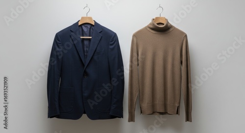 man, fashion, clothing, style, blazer, jacket, blue, turtleneck, sweater, camel, knitwear, apparel, outfit, clothes rack, casual attire, formal, business, smart, elegant, sophisticated, classic, timeless, modern, clean, minimalist, studio, shot, hanging, garment, textile, fabric, wool, cashmere, cotton, polyester, blend, winter, autumn, fall, spring, menswear, designer, luxury, high-quality, tailored, professional