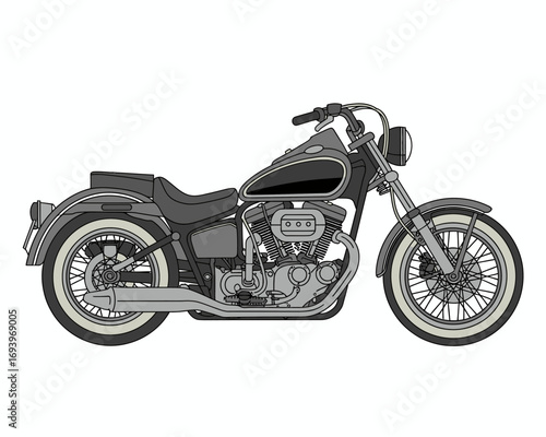 Classic Motorcycle Side View Illustration on White Background Vintage Style Chopper with Detailed Engine and Frame Ideal for Automotive Enthusiasts