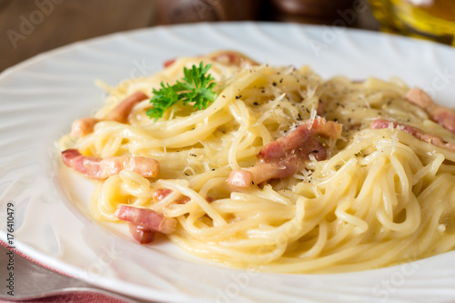 Classic pasta carbonara. Spaghetti with bacon, egg yolk and parmesan cheese on white plate on dark wooden background.