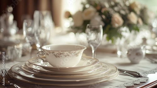 Classic porcelain dinnerware set on a formal dining table, no people, with room for copy text