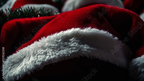Classic Santa hats in various colors and styles, showcasing detailed designs and textures, emphasizing holiday cheer and festive fashion for Christmas content.