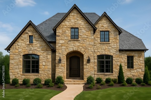 Classic Stone Home: Symmetrical Facade, Arched Entry, and Slate Roof