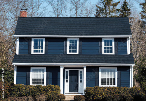 Classic two-story blue colonial house with a neat front garden, clean exterior, and traditional design – family home with a welcoming atmosphere – AI Generative.