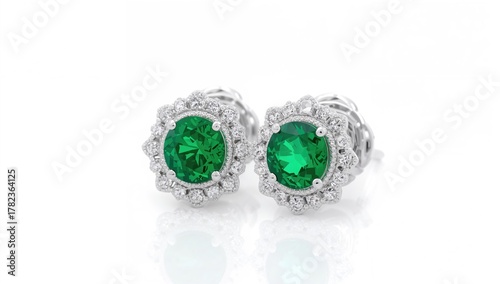 Classic white gold earrings featuring a green gemstone on a plain white backdrop