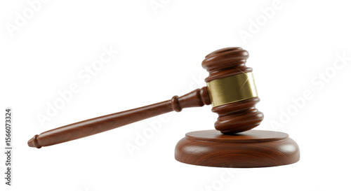 Classic Wooden Judge's Gavel with Brass Band Resting on Sound Block isolated on Transparent Background