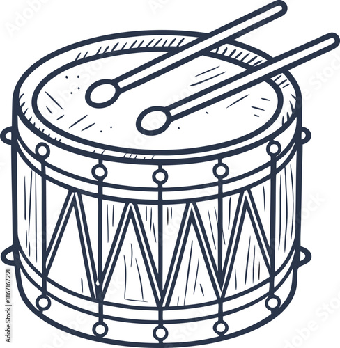 Classic wooden snare drum with drumsticks, hand drawn musical instrument illustration