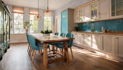 classical, home, kitchen, interior, dining table, cabinet, closeup, warm tones, cosy, inviting, elegant, refined, high-end, polished, roomy, natural light, functional, organised, welcoming, nostalgic, charming, timeless, sophisticated, harmonious, tranquil