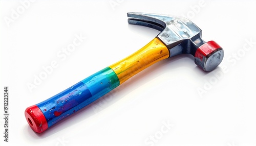 hammer, claw, tool, carpenter's shop, construction, nail, wood, strike, pull, grip, handle, red, blue, yellow, many-coloured, metallic, steel, iron, hard-wearing, resilient, strong, sturdy, functional, practical, utility, equipment, machinery, workplace, factory, building, architecture, craftsmanship, artistry, design, innovation, creativity, aesthetic, branding, marketing, commerce, representation, authenticity, unique, iconic, memorable, striking, bold, timeless, classic