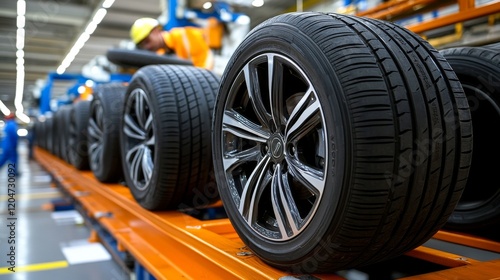 Clean and fresh factory scene with tires lined up in perfect order, clearly showcasing their tread, with car wheels positioned beside them.
