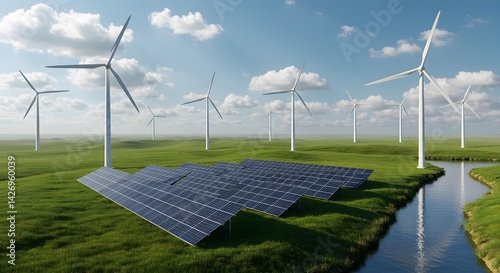 Clean Energy Solar Panels Wind Turbines in Green Field