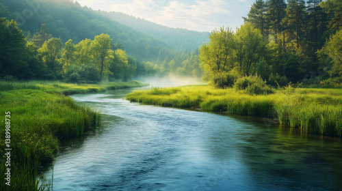 river, flowing, nature, landscape, greenery, forest, calm, calmness, environment, water, sunlight, scenic, summer, outdoors, peaceful, clear, ecosystem, wilderness, natural, serene, freshness, ecology, river bank, flora, serenity, biodiversity, summer day, clean water, vibrant, picturesque, tree, hill, mist, scenic view, morning light, flora and fauna, peacefulness, environmental conservation, environmentally friendly