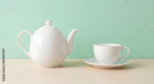 Clean white teapot and cup on a table with a light green background