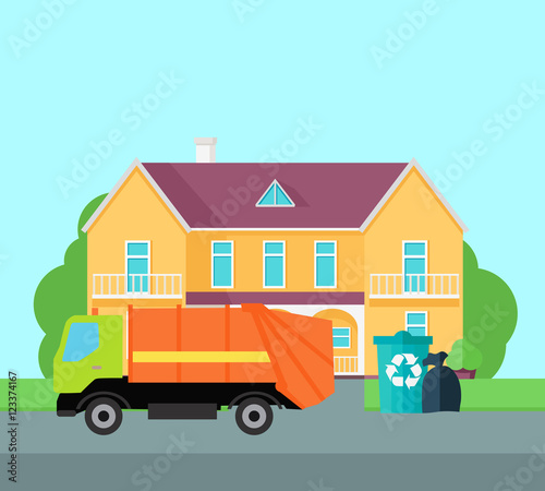 garbage, sorting, recycling, trash, cleaning, truck, municipal, utility, service, bag, container, work, environment, concept, vector, illustration, flat, design, environmental, waste, symbol, ecology, clean, segregation, daily, signs, reusing, can, social, organisation, pollution, bin, utilization, urban, city, house, bungalow, consciousness, responsibility, industry, equipment, job, transportation, car, vehicle, sanitation, machine