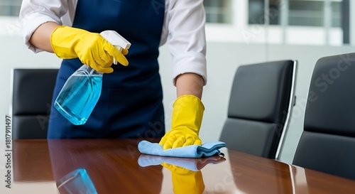 cleaning, service, wipe, wood, table, blue, spray, yellow, glove, cleaner, clothes, office, conference room, surface, hygiene, sanitizing, disinfection, housekeeping, maintenance, care, apron, uniform, indoor, furniture, chair