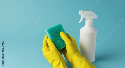 Cleaning Supplies Hands in Yellow Gloves Holding a Green Sponge and Spray Bottle