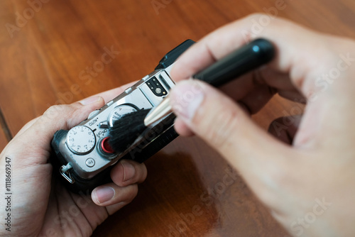 Cleaning the camera body with cleaning brush from dust and dirt on wooden table and. Cleaning and care of the camera body. The concept of care for professional photographic equipment.