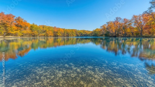 Clear blue lake with autumn trees reflecting on the surface, viewed from the lakea??s edge for a serene scene.