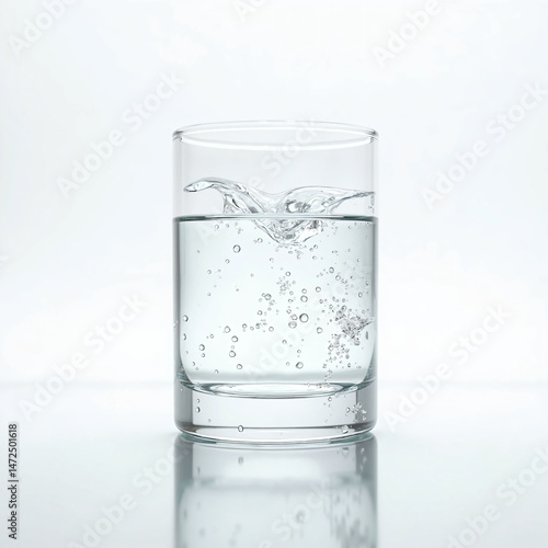 Clear Glass Filled with Water, Capturing a Splash and Bubbles as the Liquid is Disturbed, Highlighting Fluid Motion and Transparency