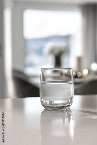 Clear glass of water standing on a light wooden surface with a blurred living room background. Glass of water on wooden table in modern living room