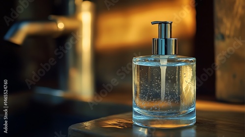 hand, bottle, clear, liquid, dispenser, pump, glasses, wooden, surface, light, dark, bathroom, faucet, washroom, hygiene, health, clean, protection, safety, soap, disinfectant, product, container, modern, design, closeup, detail, object, home, interior, still, life, portable, transparent, amber, warm, illumination, sharpened, lighting, ambient, shallow, depth