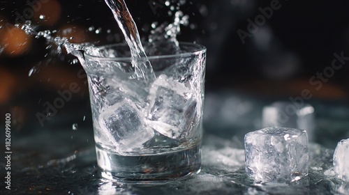 Clear liquid pours into short glass filled with large ice cubes causing dramatic splash and droplets on dark wet surface