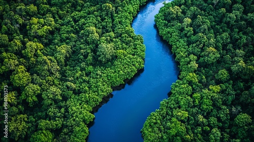 Clear, pristine river winding through a dense forest with vibrant foliage