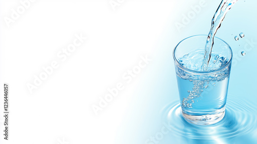 Clear water flows gently from a jug into a transparent glass, creating ripples and bubbles in the water, highlighted by a light blue background that adds tranquility to the moment
