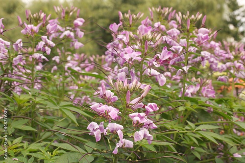 Cleome or also Spider flower. Spider flower colony in the park.