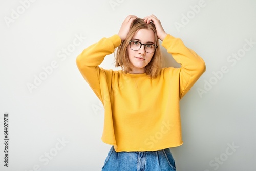 clever, smart, thinks, girl, young, woman, student, goggles, portrait, schoolgirl, emotion, blond, pose, gesture, grimace, opinion, thoughtful, pensive, interested, question, concept, hand, dilemma, wonder, plan, decision, look, puzzled, serious, information, skeptic, finger, work, idea, confident, signs, imagination, inspiration, pointing, genius, intelligent, solution, creative, dream