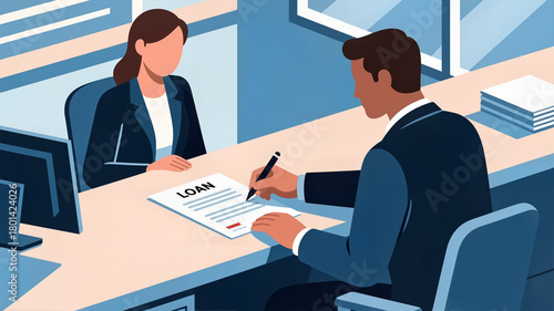 signing, bank, client, contract, finance, business, document, man, woman, office, desk, pen, illustration, meeting, consultation, professional, client, lender, transaction, deal, approval, application, paperwork, financial institution, credit, money, mortgage, investment, economy, corporate, solution, growth, security, official, term, condition, signature, adviser, funding