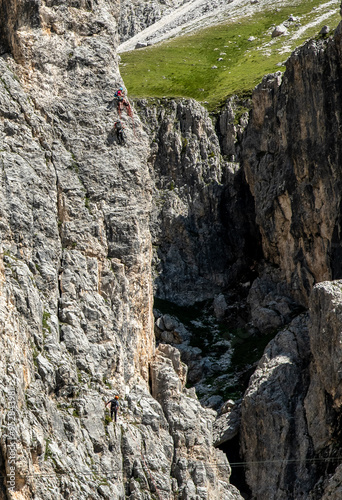 Climbers engaged on a vertical rock face near the Vajolet refuge