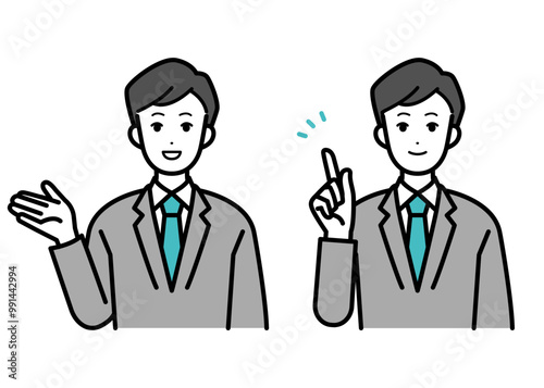 set, explanation, guidance, proposal, customer service, interview, introduction, business, man, businessman, suit, work, young, company, simple, illustration, vector, white background, smile, upper body, pose, generic, japanese