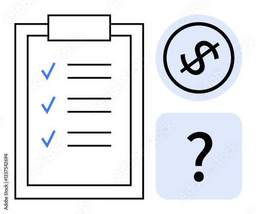 Clipboard with checklist, dollar sign circle, and question mark symbolizing planning, financial goals, and decision-making. Ideal for finance, organization, goals, uncertainty business planning
