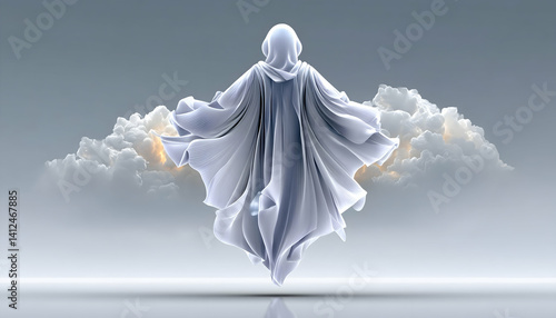 ghost, spirit, soul, aethereal, mystical, fantasy, magical, supernatural, floating, cloud, sky, heaven, angel, robe, cloak, hood, figure, silhouette, serene, peaceful, calm, tranquil, spiritual, religious, divine, holy, sacred, mystery, enigma, wonder, awe, ascension, transcendence, cosmic, celestial, dreamscape, imagination, surreal, art, digital, three-dimensional, rendering, background, wallpaper, illustration