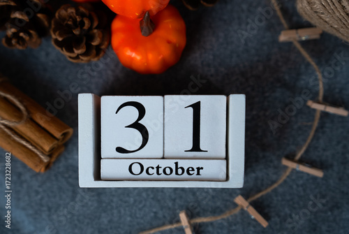 Close crop of 31 October calendar blocks on textured cloth surrounded by mini pumpkins and cinnamon, seasonal detail shot.