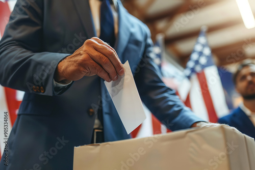 close up a man's hand drops his vote into the ballot box,business suit,voting at polling station, American flags in the background, blurred background