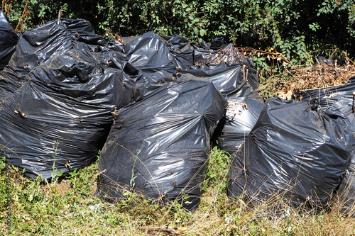 close up big black garbage bags with dry grass and branches against the background of trees in the Park