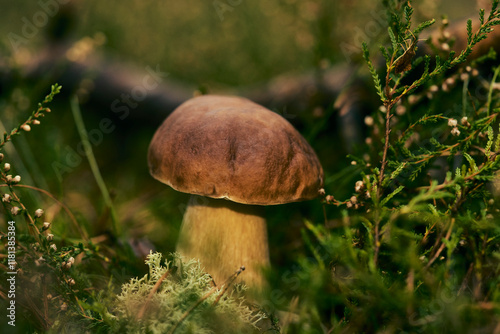 Close up brown porcini mushroom among green undergrowth in woods