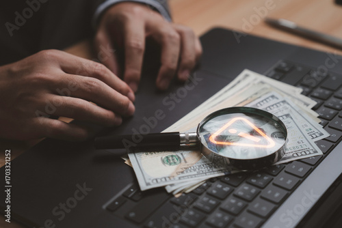 Close up businessman hand working on laptop with dollar bills and caution sign on magnifying glass symbolizing financial scammer money fraud risk online security cybercrime and digital economy safety