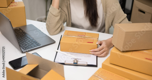 Close up Busy asian entrepreneur woman checking product on stock searching with laptop. Business woman working SME online at home. Find product parcel. Small business owner start up concept.