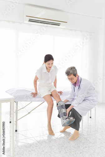 close up doctor, doctor assess leg of patient and explain to use air cast, patient wear air cast walking bootwalk, training and rehabilitation